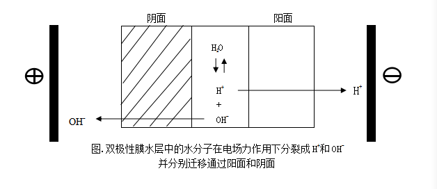 雙極性膜,電驅(qū)動膜的一種,主要作用是在電場力下提供H+離子和 OH-離子,膜的一側(cè)為陰面,另一側(cè)為陽面,陰面和陽面的中間層為水層,在外加直流電場力的作用下,水層中的H2O分裂成H+離子和OH-離子,并分別通過陽面和陰面,如圖所示: