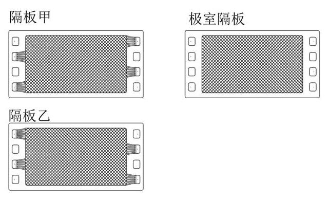 總次序為:陽極板,極室隔板,極膜,隔板甲,陽膜,隔板甲,陰膜,隔板乙;陽膜,隔板甲,陰膜,隔板乙;……;陽膜,隔板甲,陰膜,隔板乙;陽膜,隔板甲,陰膜,隔板乙;極膜,極室隔板,陰極板。一共為40組,有41個濃水室,40個淡水室,隔板甲所處的濃水室,隔板乙為淡水室。