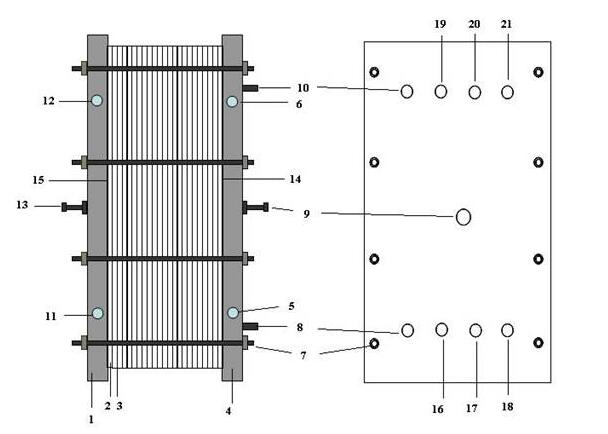 (1)陽極導(dǎo)流板;(2)彈性隔板;(3)膜;(4)陰極導(dǎo)流板;(5) 陰極液進水口;(6)陰極液出水口;(7)緊固螺栓;(9)陰極接線柱;(11)陽極液進水口;(12)陽極液出水口;(13)陽極接線柱;(14)陰極;(15)陽極;