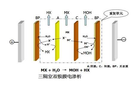 由雙極膜,陰膜和陽(yáng)膜組合構(gòu)成酸、堿、鹽三室(如下圖),鹽的陰離子透過(guò)陰膜與雙極膜產(chǎn)生的H+離子結(jié)合后生成酸,另一方面陽(yáng)離子透過(guò)陽(yáng)離子交換膜與雙極膜產(chǎn)生的OH— 離子結(jié)合后生成堿。過(guò)程相當(dāng)于中和反應(yīng)的逆反應(yīng)過(guò)程。